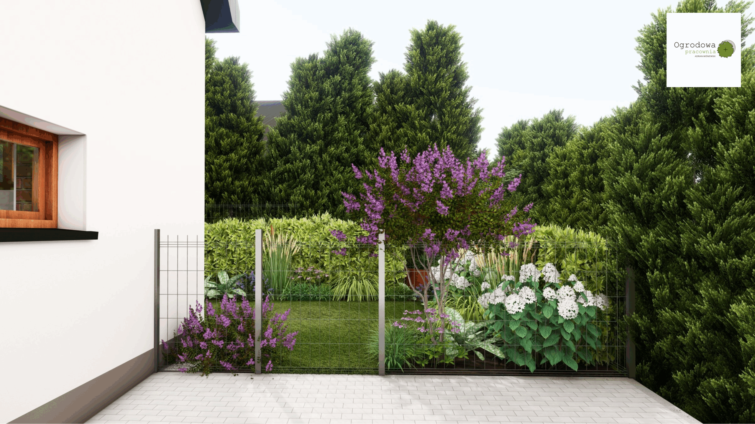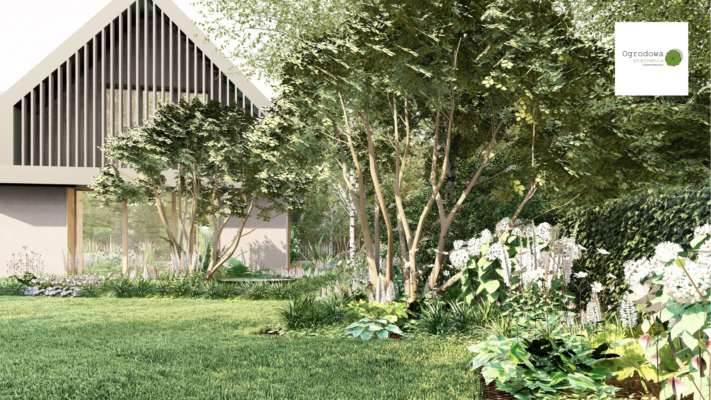 Ogród reprezentacyjny z dużą częścią frontową do przyjmowania gości. Szata roślinna utrzymana w eleganckim stylu z zachowaniem różnorodności roślin atrakcyjnych o każdej porze roku. W projekcie znalazło się również duża cześć za domem przeznaczona na warzywnik i sad.