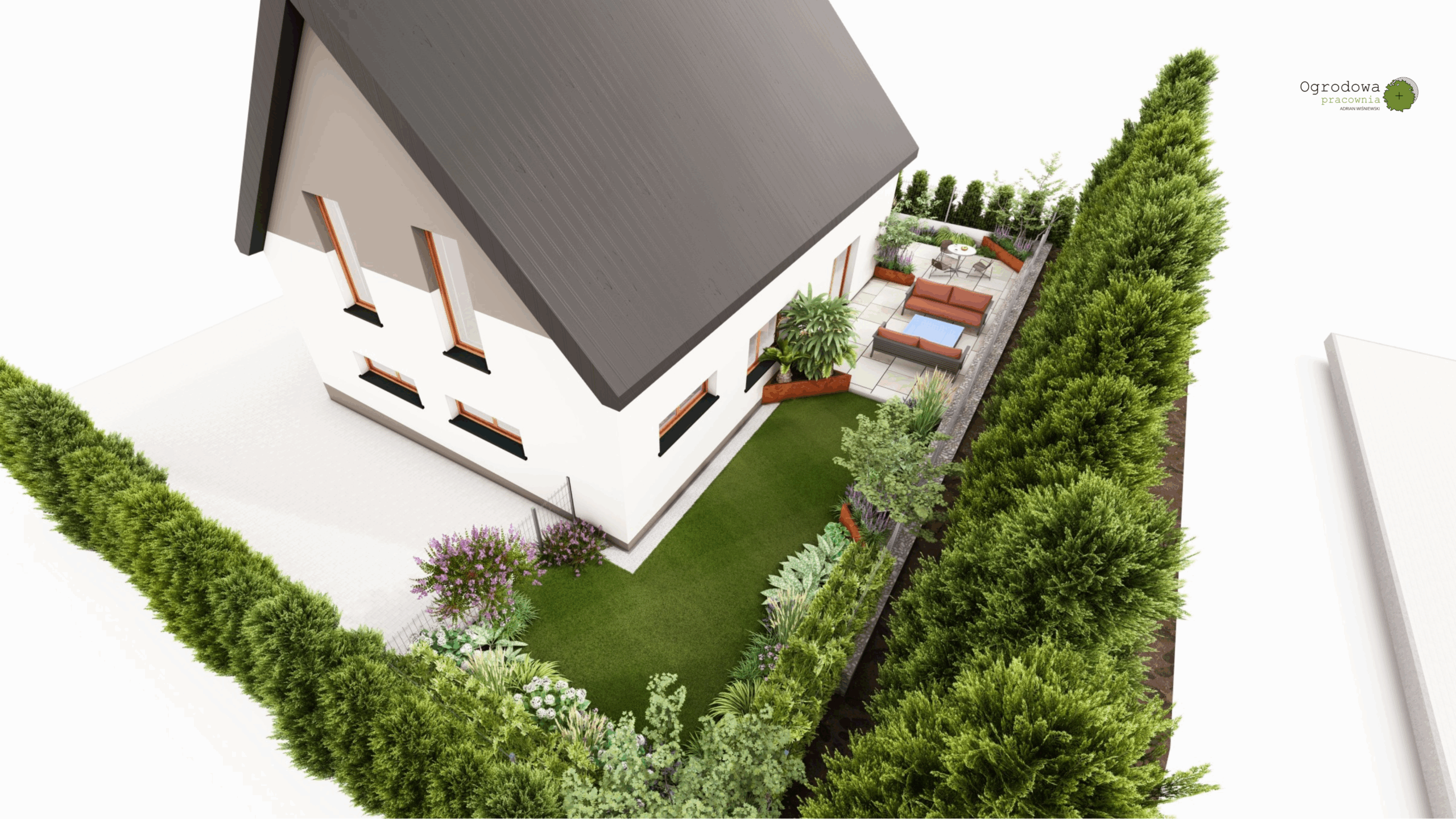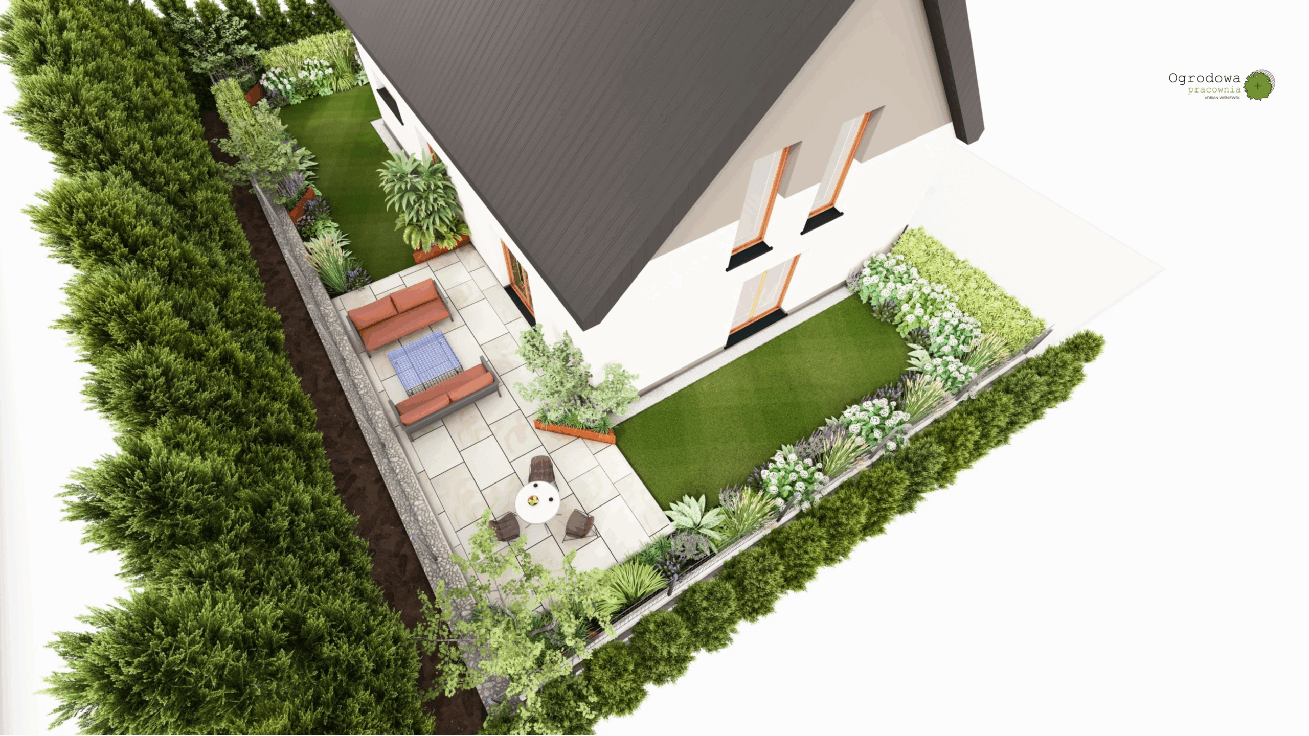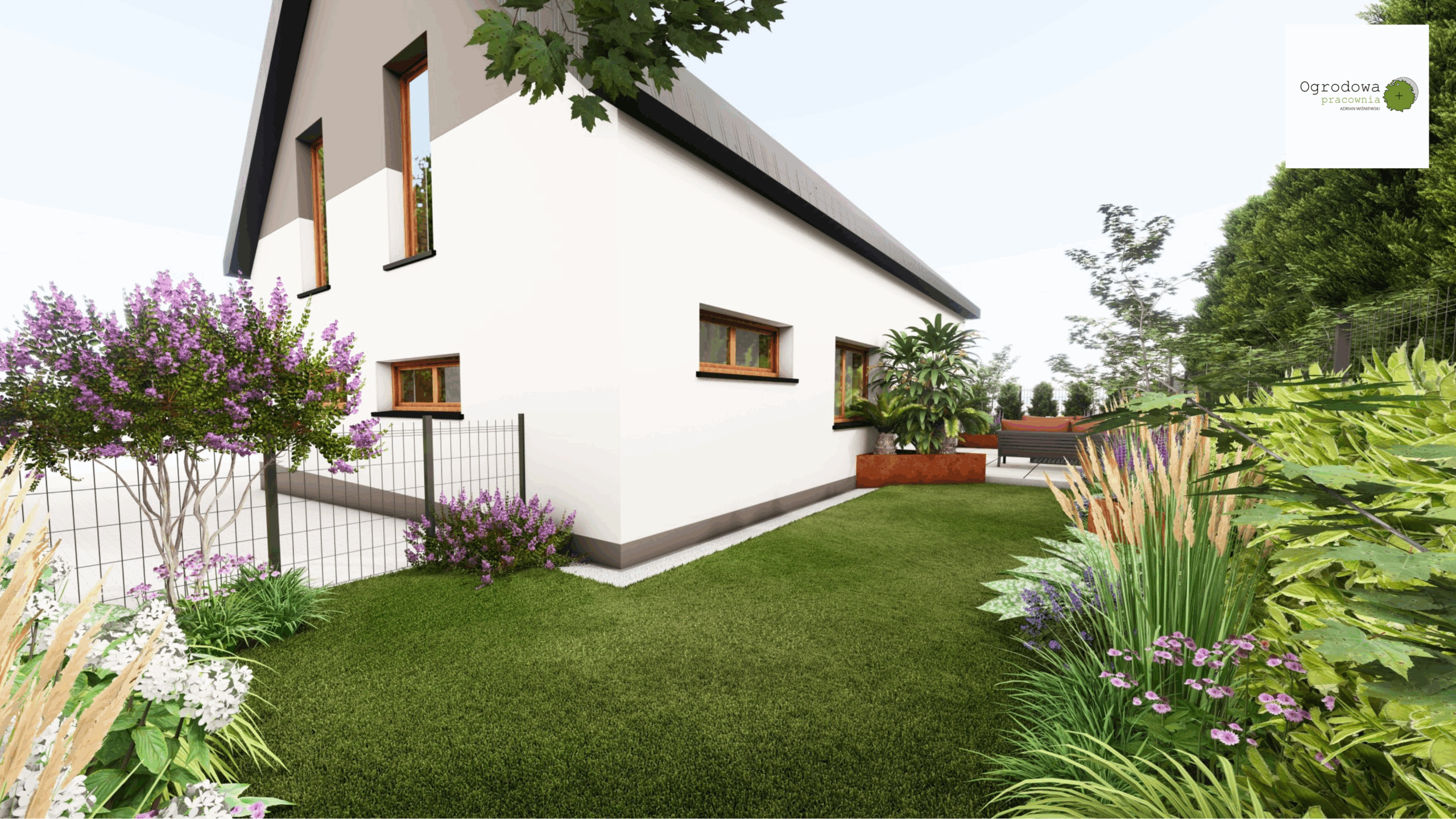 Projekt tego ogrodu łączy w sobie funkcjonalność, komfort użytkowania i naturalistyczne założenia. Strefowy układ przestrzeni pozwala na maksymalne wykorzystanie terenu i stworzenie miejsca dopasowanego do różnych potrzeb mieszkańców.