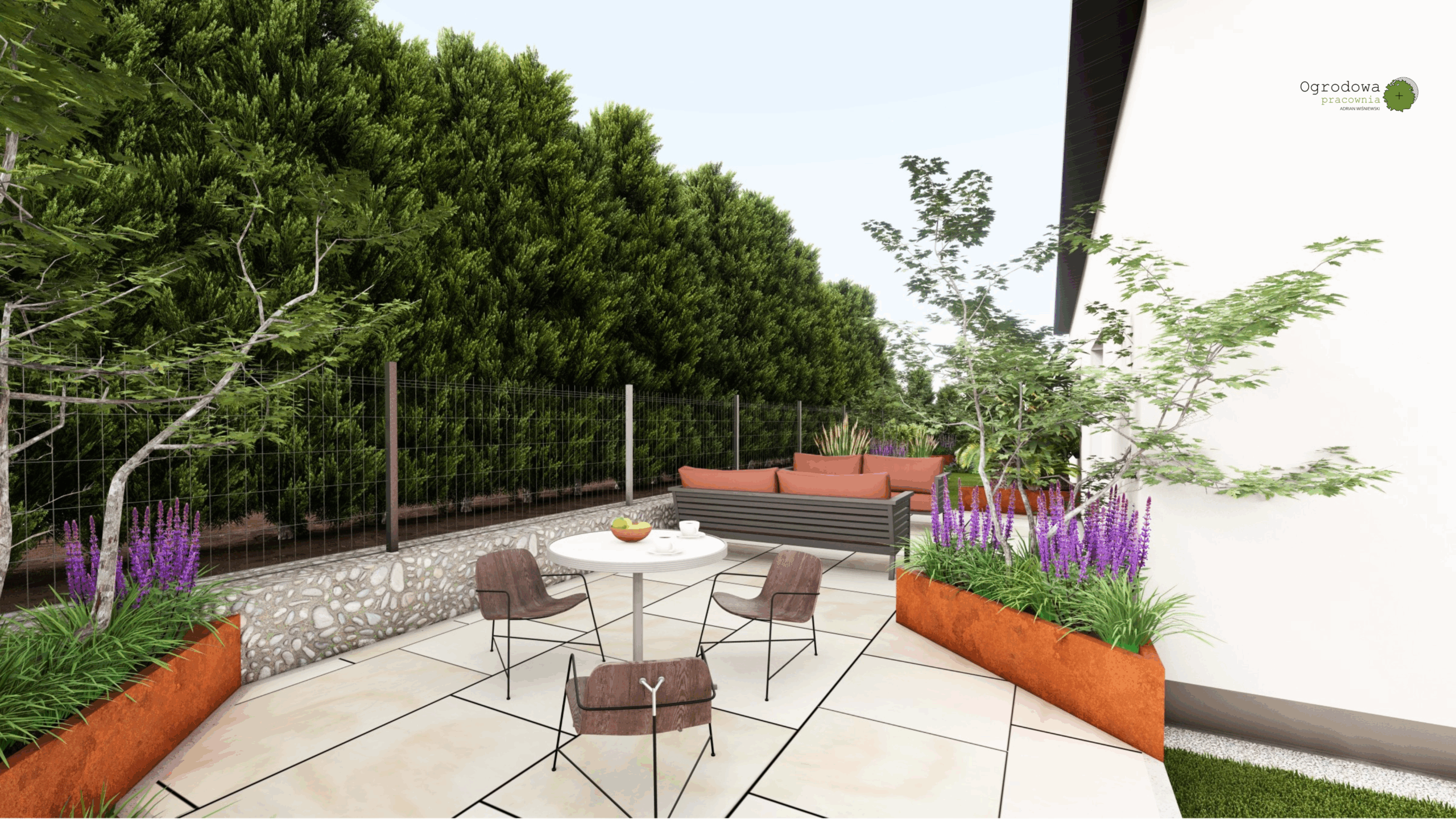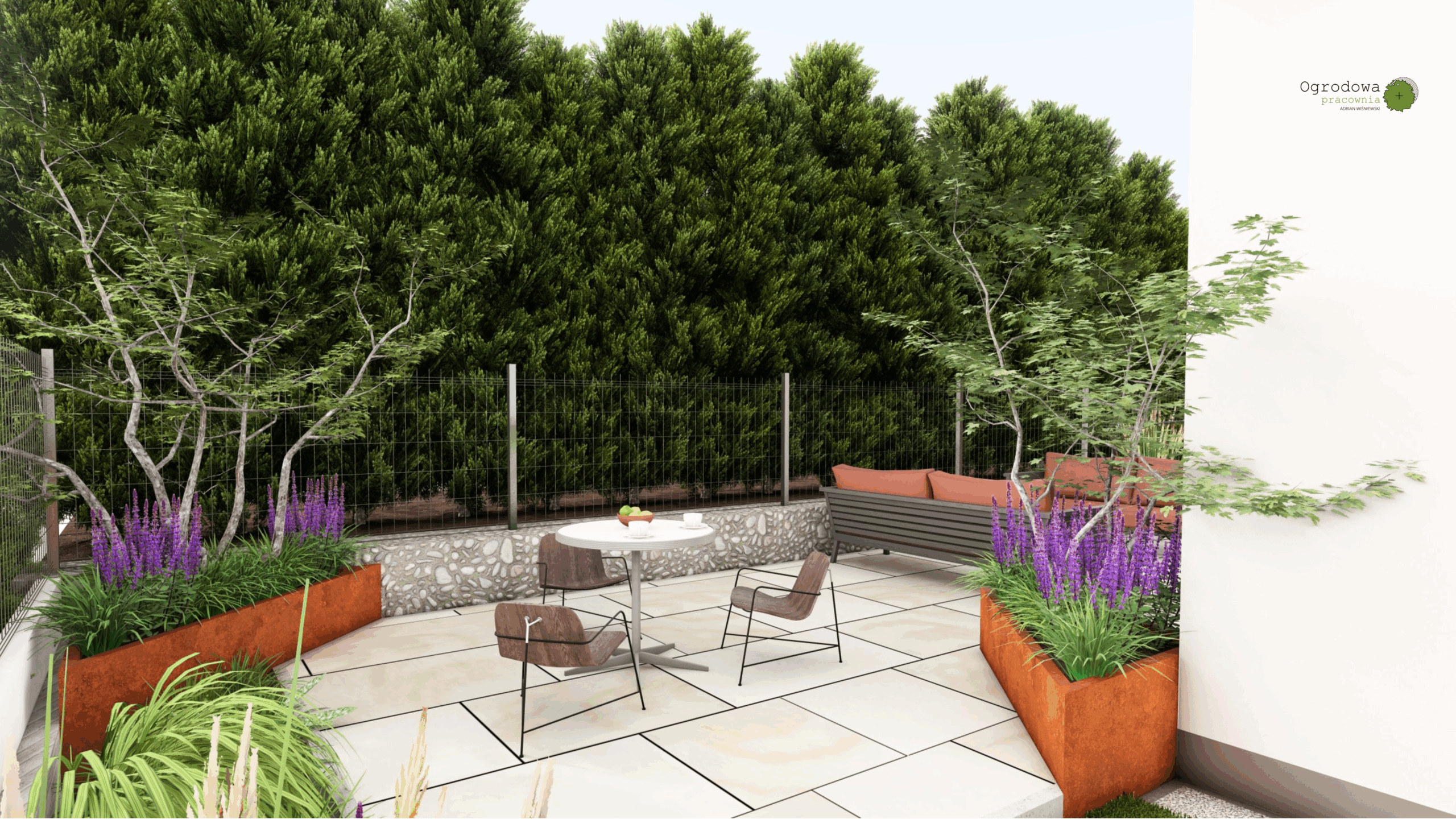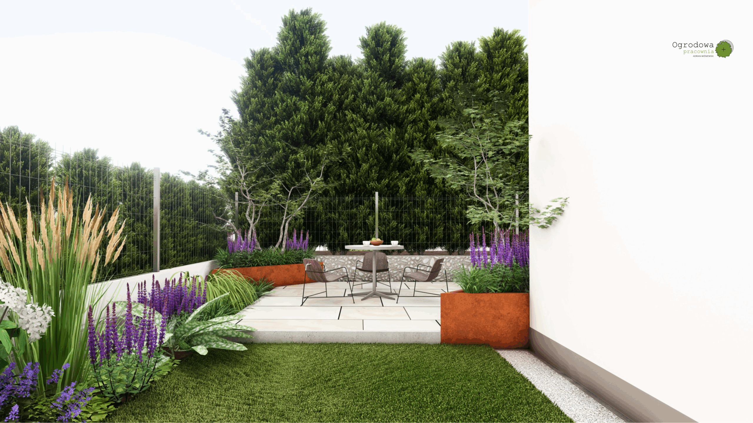 Niewielki ogród w kształcie litery „L” z wielkim tarasem. Cortenowe donice oraz oryginalne oświetlenie zabierające ten mały ogród w duży wymiar.