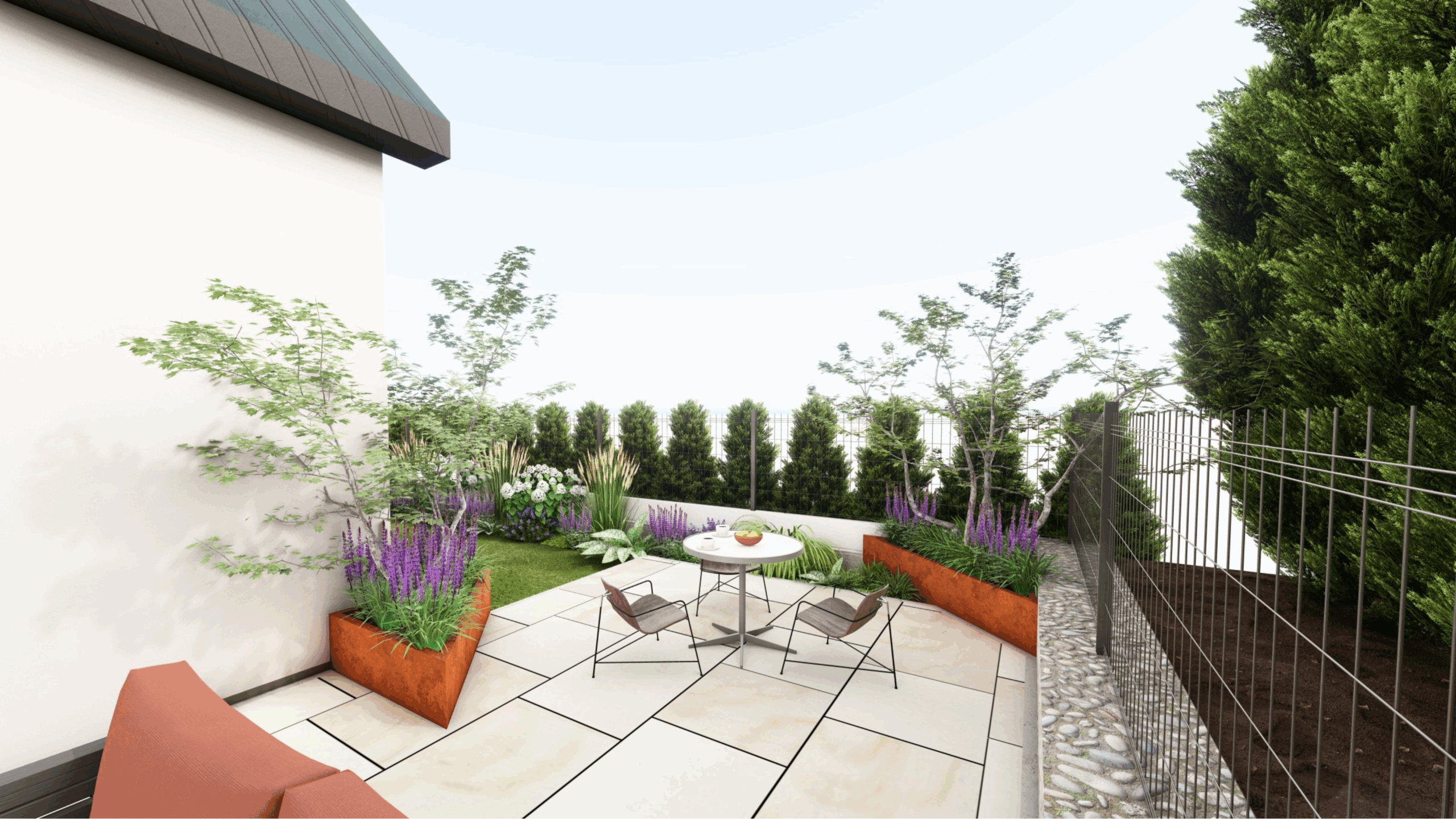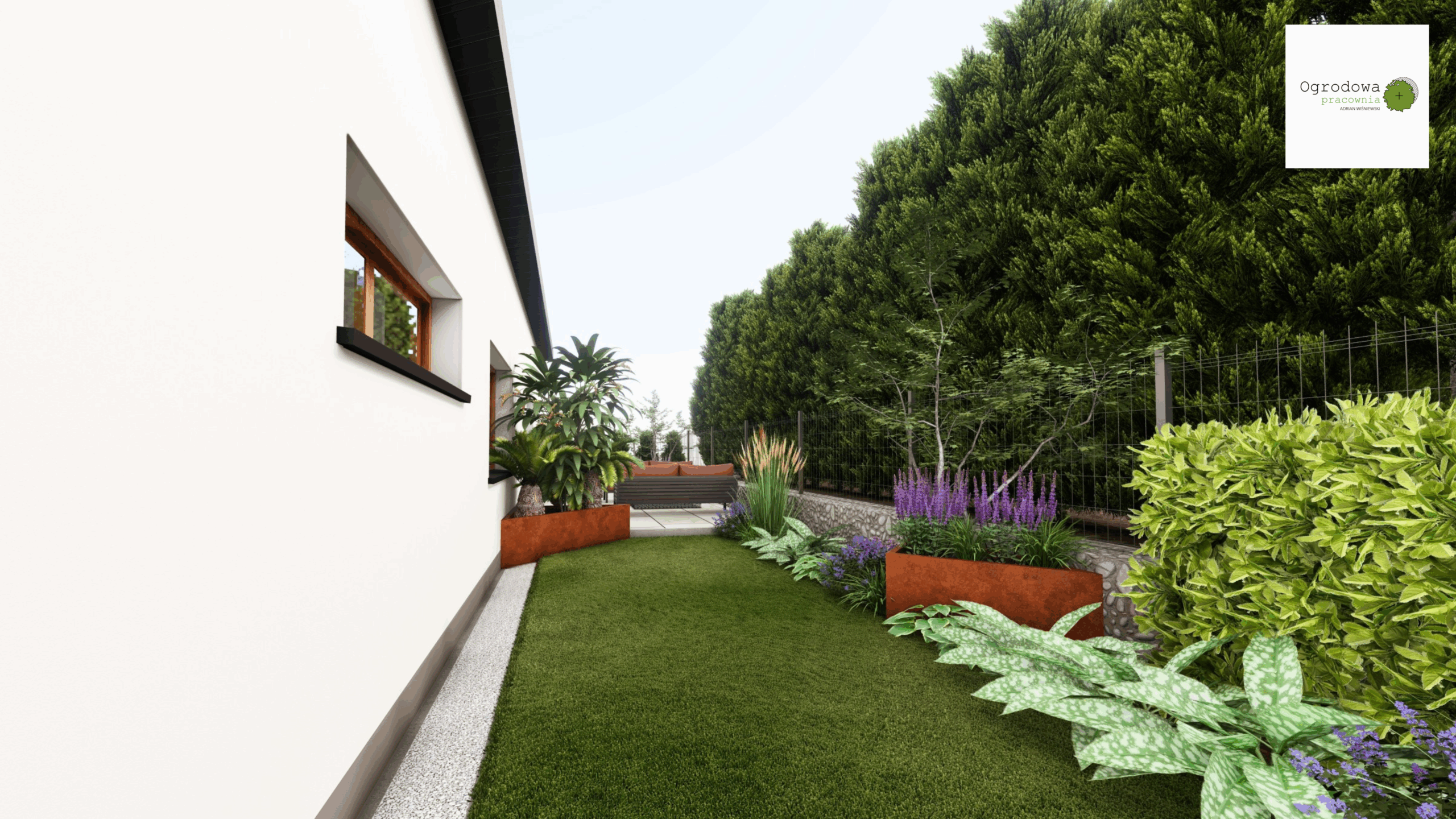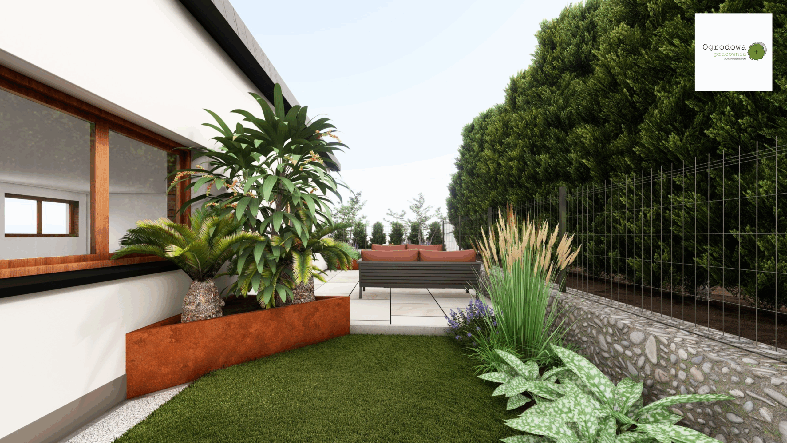 Niewielki ogród w kształcie litery „L” z wielkim tarasem. Cortenowe donice oraz oryginalne oświetlenie zabierające ten mały ogród w duży wymiar.