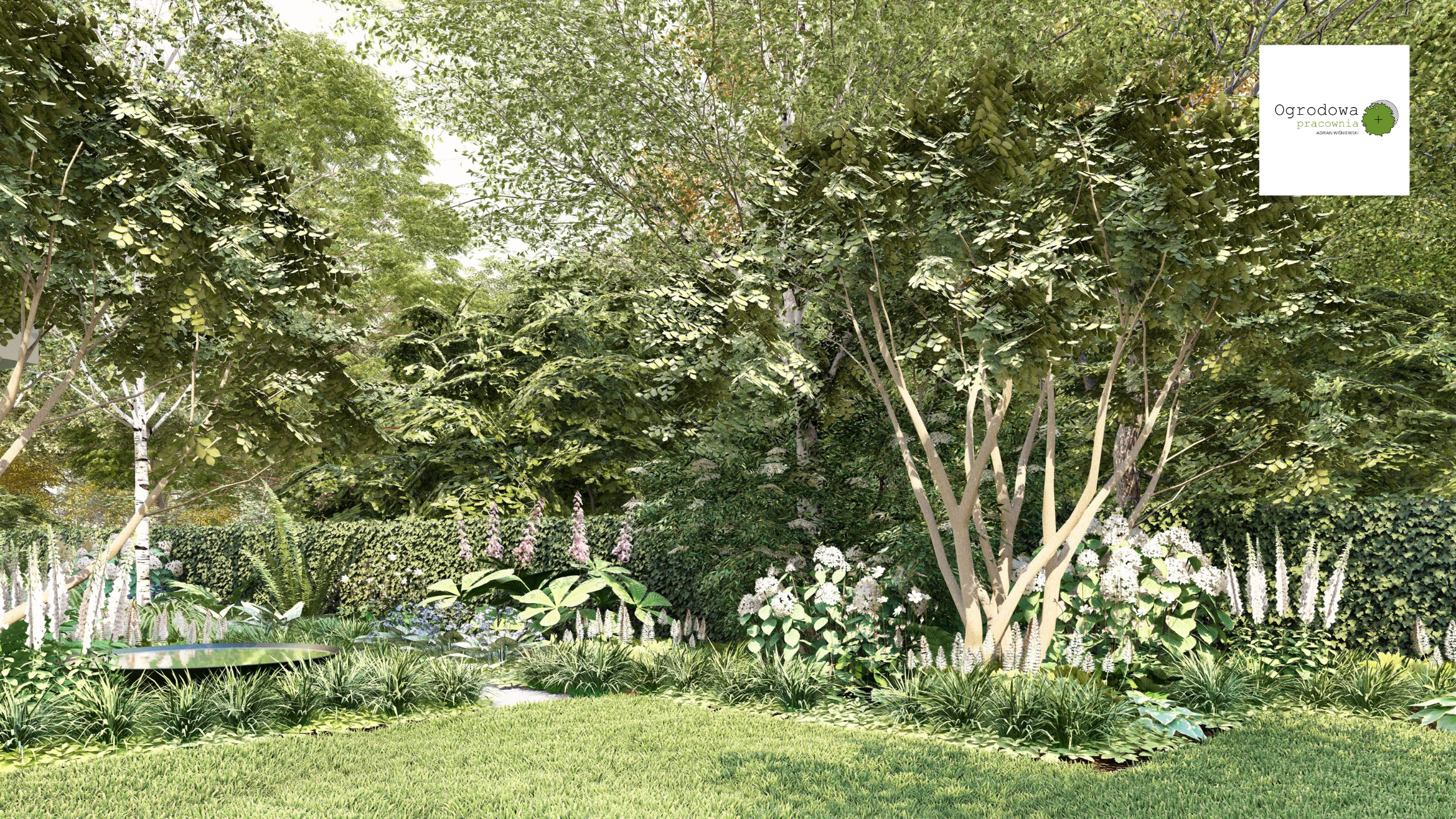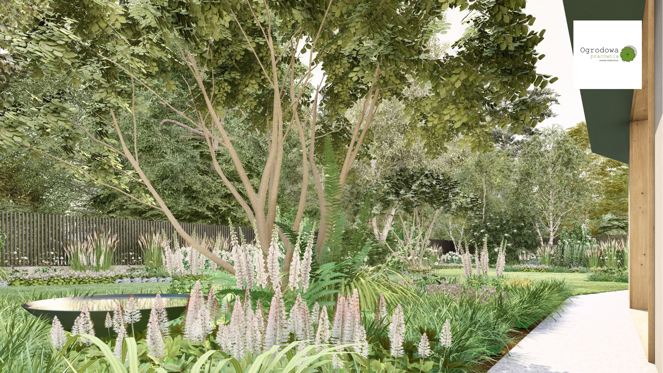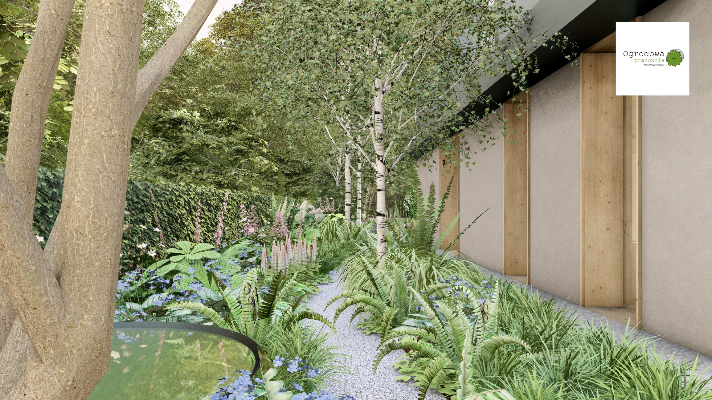 Delikatne lustra wodne, nastrojowe oświetlenie i miękka geometria ścieżek tworzą atmosferę spokoju i bliskości z przyrodą.